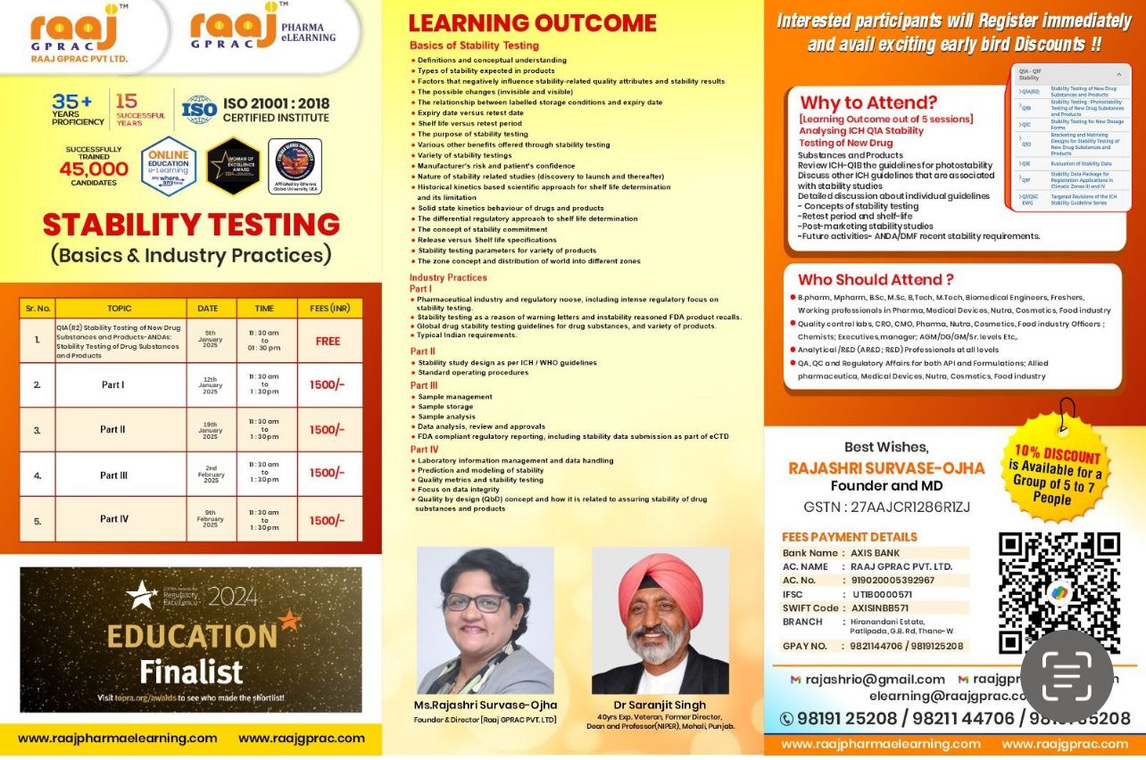 Please join us for important series of webinars on “Stability Studies, Basics and Industry Practices “ which will be held on Sundays from January 2025!!